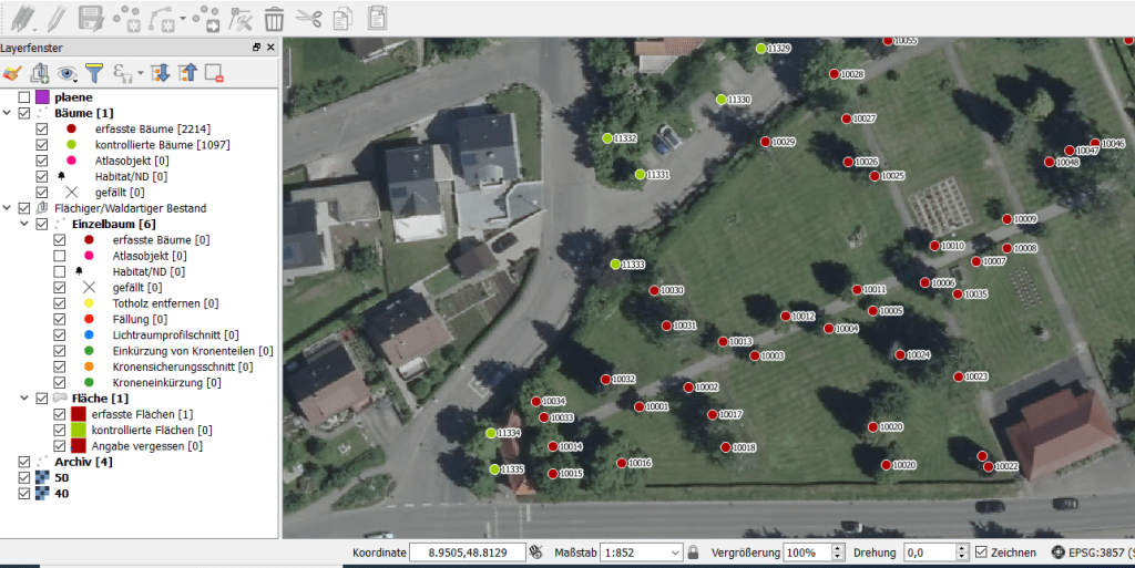 Teil unserer Arbeit ist die praktische Baumkontrolle nach der VTA-Methode und die Erstellung und Pflege von ganzen Baumkatastern. So haben wir z.B. für die Stadt Rutesheim und die Gemeinde Deckenpfronn jeweils ein Baumkataster erstellt, welche alle relevanten Bäume der Gemeinden beinhalten.
